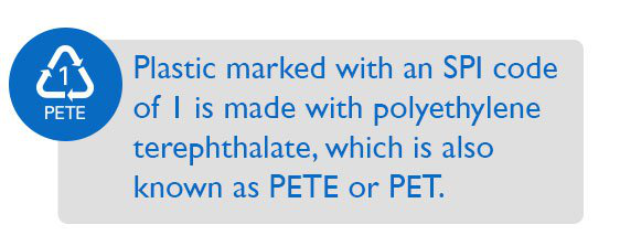1 এসপিআই কোডের সাথে চিহ্নিত প্লাস্টিকটি পলিথেইলিন টিরেফথালেট দিয়ে তৈরি করা হয়, যা PETE বা PET নামেও পরিচিত। PETE- ভিত্তিক পাত্রে কখনও কখনও তাদের ভিতরে সংরক্ষিত হয় যে খাবার এবং পানীয় থেকে odors এবং স্বাদ শোষণ। এই প্লাস্টিক থেকে তৈরি আইটেম সাধারণত পুনর্ব্যবহৃত। পেট প্লাস্টিকের অনেক সাধারণ পরিবারের আইটেম যেমন বোতল বোতল, ঔষধ জার, চিনাবাদাম মাখন জার্স, কম্বস, বীজ ব্যাগ এবং দড়ি। পুনর্ব্যবহৃত PETE শীতকালীন পোশাক মধ্যে টোট ব্যাগ , কার্পেট, ফাইবারফিল উপাদান, এবং আরো করতে ব্যবহার করা হয়।