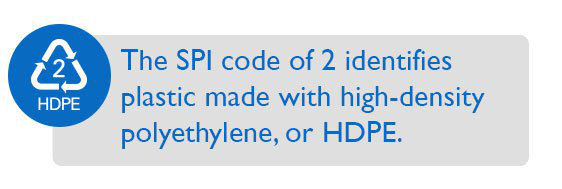 এসপিআই কোড 2 উচ্চ-ঘনত্বের পলিথিলিন, বা এইচডিপিই দিয়ে তৈরি প্লাস্টিক চিহ্নিত করে। এইচডিপিই পণ্যগুলি খুব নিরাপদ এবং খাদ্য বা পানীয়ে কোন রাসায়নিক পদার্থ ছিঁড়ে ফেলার জন্য পরিচিত না। (তবে, পূর্বে অনুষ্ঠিত পদার্থ থেকে দূষিত হওয়ার ঝুঁকি কারণে, দয়া করে মনে রাখবেন: কোনও HDPE বোতলকে খাদ্য বা পানীয় পাত্রে পুনঃব্যবহারের জন্য এটি নিরাপদ নয় যদি এটি মূলত খাদ্য বা পানীয় ধারণ করে না!) এইচডিপিই পণ্যগুলি সাধারণত পুনর্ব্যবহৃত হয়। এই প্লাস্টিক থেকে তৈরি আইটেমগুলি দুধ, মোটর তেল, শ্যাম্পো এবং কন্ডিশনার, সাবান বোতল, ডিটারজেন্ট এবং রক্তচাপের জন্য পাত্রে অন্তর্ভুক্ত। অনেক ব্যক্তিগতকৃত খেলনা পাশাপাশি এই প্লাস্টিক থেকে তৈরি করা হয়। পুনর্ব্যবহৃত এইচডিপিই প্লাস্টিকের crates, প্লাস্টিকের কাঠ, বেড়া, এবং আরো করতে ব্যবহৃত হয়।