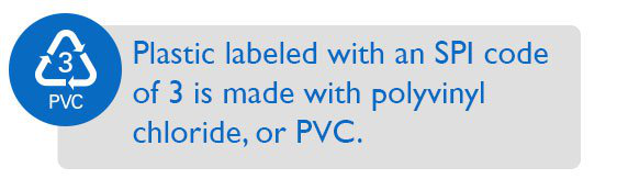 একটি SPI কোড 3 দিয়ে লেবেলযুক্ত প্লাস্টিকটি পোলাইভিনাইল ক্লোরাইড, বা পিভিসি দিয়ে তৈরি করা হয়। পিভিসি প্রায়শই পুনর্ব্যবহৃত হয় না এবং ingested যদি ক্ষতিকারক হতে পারে। পিভিসি সব ধরনের পাইপ এবং টাইল জন্য ব্যবহার করা হয়, কিন্তু এটি সাধারণত নদীর গভীরতানির্ণয় পাইপ পাওয়া যায়। এই ধরনের প্লাস্টিকের খাদ্য আইটেমের সাথে যোগাযোগ করা উচিত নয়। পুনর্ব্যবহৃত পিভিসি মেঝে, মোবাইল হোম skirting, এবং অন্যান্য শিল্প-গ্রেড আইটেম করতে ব্যবহৃত হয়।