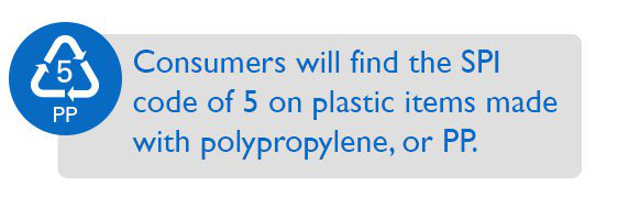 ভোক্তাদের পলিপ্রোপ্লিন, বা পিপি দিয়ে তৈরি প্লাস্টিকের আইটেমগুলিতে 5 এর এসপিআই কোড খুঁজে পাবে। পিপি পুনর্ব্যবহৃত করা যেতে পারে কিন্তু সাধারণভাবে PETE বা HDPE হিসাবে পুনর্ব্যবহারযোগ্য জন্য গ্রহণ করা হয় না। প্লাস্টিকের এই ধরনের শক্তিশালী এবং সাধারণত উচ্চ তাপমাত্রা সহ্য করতে পারেন। অন্যান্য অনেকগুলি পণ্যগুলির মধ্যে এটি প্লাস্টিকের ডায়াপার, টিপারপারওয়্যার, মার্জারিন কন্টেইনার, দই বাক্স, সিরাপ বোতল, প্রেসক্রিপশন বোতল এবং কিছু স্টেডিয়াম কাপ তৈরি করতে ব্যবহার করা হয় । প্লাস্টিক বোতল ক্যাপ প্রায়ই পিপি থেকে তৈরি করা হয়। পুনর্ব্যবহৃত পিপি বরফ স্ক্র্যাপার, রেকেস, ব্যাটারি তারগুলি, এবং টেকসই হতে প্রয়োজন অনুরূপ আইটেম করতে ব্যবহৃত হয়।