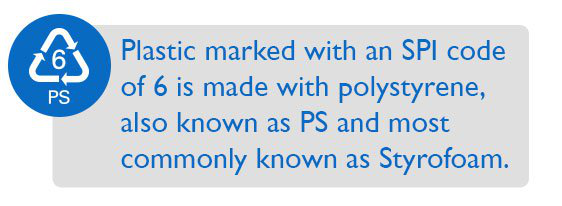প্লাস্টিকের 6 টি এসপিআই কোড দিয়ে চিহ্নিত করা হয় পিপলস্টাইরিন, যা পিএস নামে পরিচিত এবং সর্বাধিক সিটিফোয়াম নামে পরিচিত। PS পুনর্ব্যবহৃত করা যেতে পারে, কিন্তু কার্যকরীভাবে না; পুনর্ব্যবহারযোগ্য এটি অনেক শক্তি লাগে, যার অর্থ কয়েক স্থান এটি গ্রহণ করে। ডিসপোজেবল কফি কাপ , প্লাস্টিকের খাদ্য বাক্স, প্লাস্টিকের কাটিয়া, প্যাকিং ফেনা, এবং প্যাকিং চিনাবাদাম পিএস থেকে তৈরি করা হয়। পুনর্ব্যবহৃত পিএস ইনসুলেশন, লাইসেন্স প্লেট ফ্রেম এবং শাসকদের সহ বিভিন্ন ধরণের পণ্য তৈরি করতে ব্যবহৃত হয়।